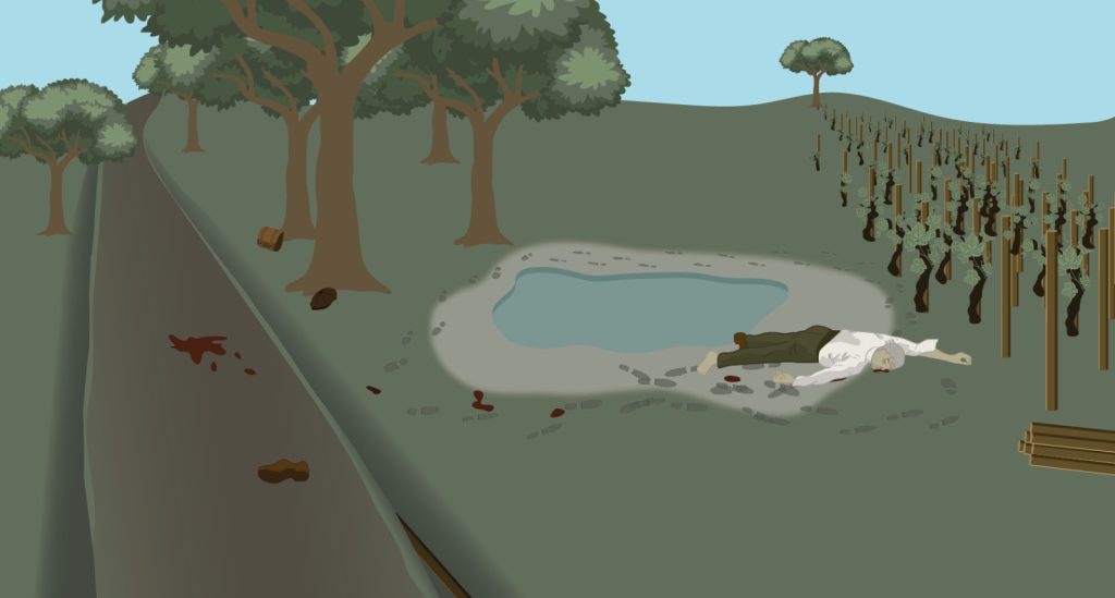 Lors de l’autopsie du cadavre, le médecin constate d’abord une fracture comminutive des os propres du nez, plusieurs ecchymoses à l’œil gauche et à la région frontale. Cette fracture aurait été provoquée par un seul coup violent, assené sur le côté gauche de la face du crâne. L’arme du crime serait un instrument contendant : un échalas trouvé sur place.