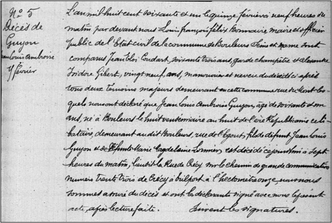 « L’an mil huit cent soixante et un le quinze février neuf heures du matin par devant nous Louis François Felix Bonnaire, maire et officier public de l’Etat-civil de la commune de Bouleurs Seine et Marne sont comparus Jean Eloi Coudart, soixante trois ans garde champêtre et Alexandre Isidore Gibert, vingt neuf ans, manouvrier et neveu du décédé ci après tous deux témoins majeurs demeurant en cette commune rue du Mont lesquels nous ont déclaré que Jean Louis Ambroise Guyon âgé de soixante et un ans, né à Bouleurs le huit vendémiaire an huit de l’ère républicaine célibatair, demeurant au dit Bouleurs, rue de l’Égoût, fils de défunt Jean Louis Guyon et de défunte Marie Magdelaine Lormier est décédé cejourd’hui à sept heures du matin, lieudit la rue de Crécy sur le chemin de grande communication numéro trente trois de Crécy à Trilport à l’hectomètre onze, nous nous sommes assurés du décès et ont les déclarants signé avec nous le présent acte, après lecture faite ».