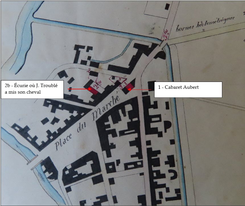 Jean Troublé est également à Crécy ce jour là. Il est venu avec son cheval qu’il a laissé dans une écurie proche de la place du marché. Il se rend vers 17h au cabaret Aubert, où il passe la soirée à jouer aux cartes avec Constant Troublé et Pierre Pottier.
